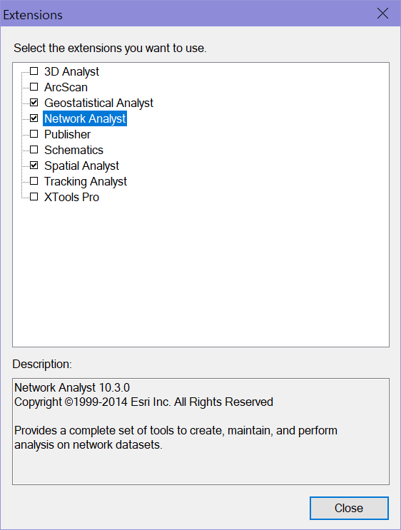 2. 메뉴 Custmize > Extensions에서 Network Analyst를 활성화한 후 Close를 클릭한다. 네트워크 분석 익스텐션을 구매하지 않았다면 이 부분이 비활성화되어 있으며, 네트워크 분석을 활용할 수 없다.