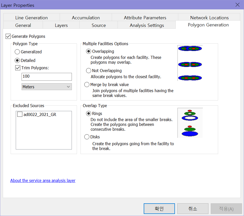 6. Polygon Generation 탭에 들어가면 Overlapping/Not Overlapping/Merge by break value, Rings/Disks 등의 옵션을 선택할 수 있다. 오른쪽에 해당하는 그림을 보면 직관적으로 이해하기 쉬울 것이다. 선택이 끝나면 확인을 클릭한다.