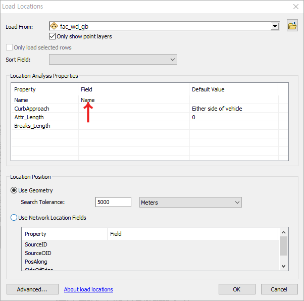 이때 추가된 Facilities들은 location 1, location 2...로 추가되는데, 원하는 이름으로 추가하기 위해서는 Location Analysis Properties 부분에 있는 Name Field에 원하는 데이터 열을 선택하면 된다.