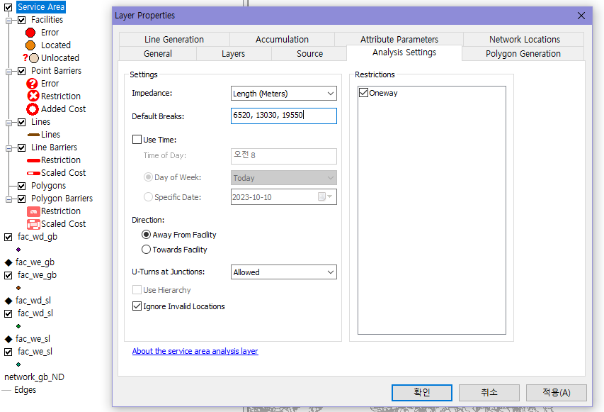 5. TOC에서 Service Area 오른쪽 클릭 > Analysis Settings > Default Breaks에 원하는 거리 구간들을 입력한다.