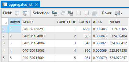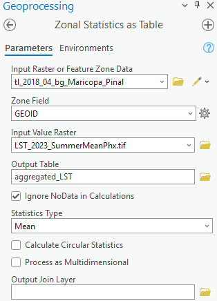 - Output table: 저장 경로 지정 (예: CBG_LandsatMean.dbf)