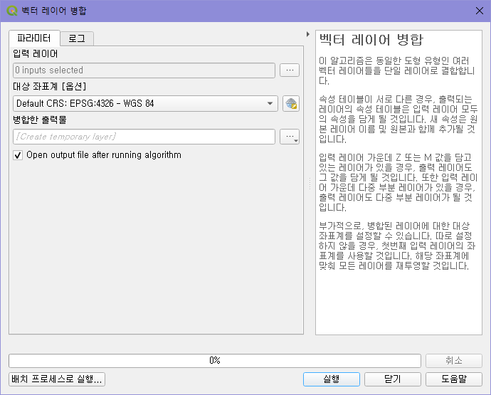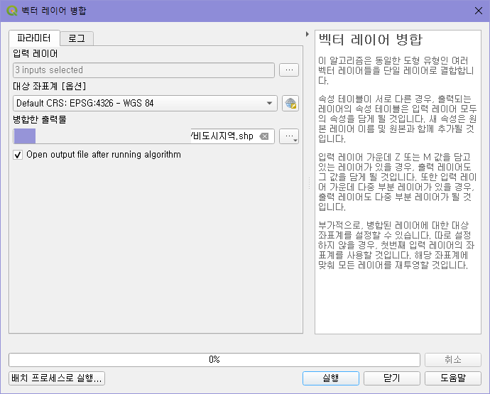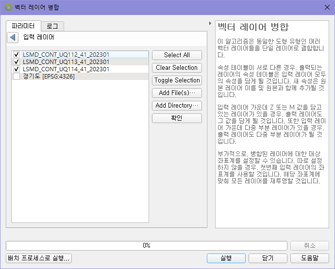 입력 레이어 옆에 있는 ... 버튼을 누르고, 합치고 싶은 shp들을 선택한다.