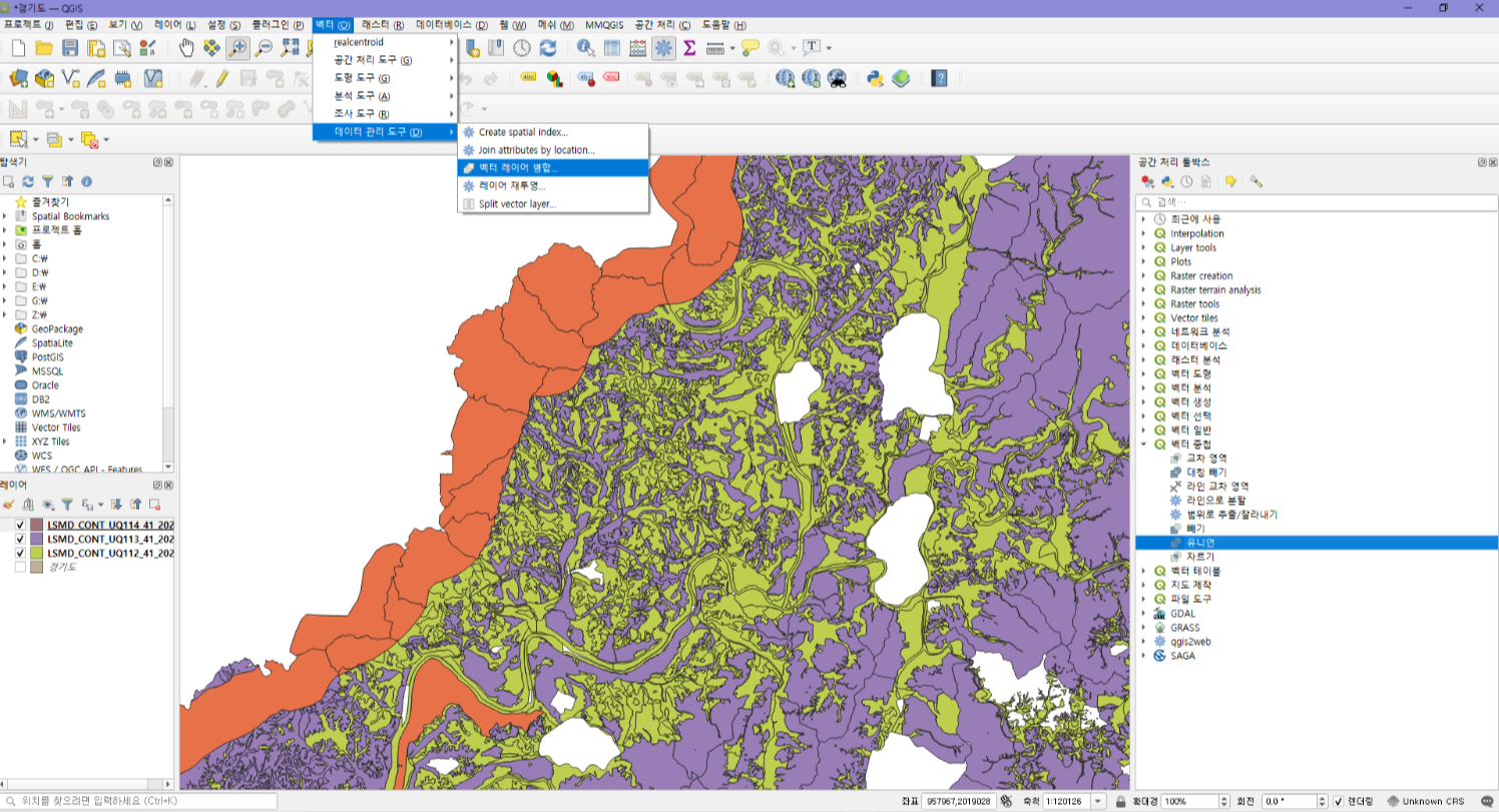 벡터 > 데이터 관리 도구 > 벡터 레이어 병합을 클릭한다.